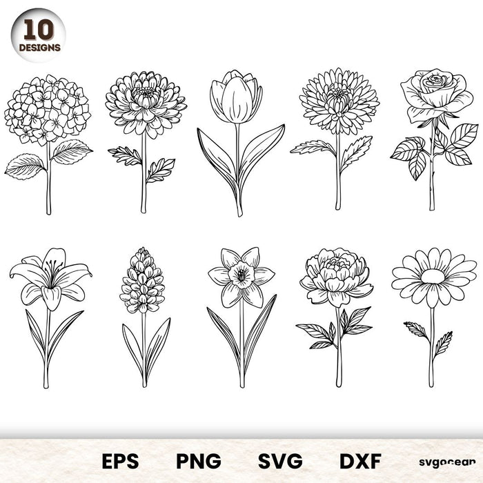 Flowers SVG Bundle comes in a single ZIP archive and includes these formats:
